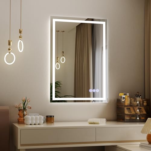Koonmi 70x50cm LED Bathroom Mirror, 3 Adjustable Lighting Modes Lighted Smart Vanity Mirror with Front and Backlight, Anti-Fog, Memory Function, Tempered Glass, Mounted Horizontally Vertically