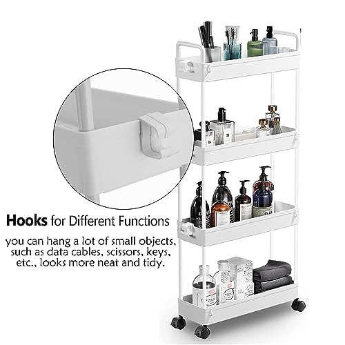 Latawon 4 Tier Slim Rolling Storage Cart,Multifunction Utility Cart Kitchen Storage Organizer,Narrow Storage Cabinet Mobile Shelving Unit for Bathroom,Kitchen,Laundry and Living Room,White,40X 92cm