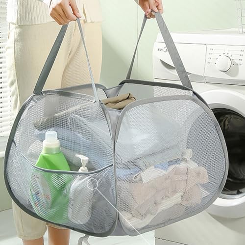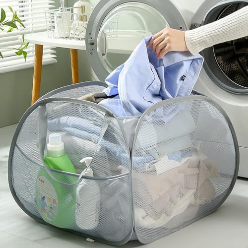 - Ꙭ Pop-Up Laundry Basket Design: Large capacity allows for easy storage of clothes that need to be changed and washed,The design of mesh fabric can improve breathability and reduce odors,After folding, it becomes a flat mesh circle with a diameter of about 8 inches and a height of 1.2 inches. It can be flexibly stored in various narrow spaces, such as the gap between the washing machine and the wall, for easy access and storage.