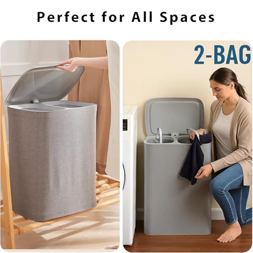 - [Space-Smart 90L Capacity]: Our large-capacity laundry baskets with two bags can hold an entire family's clothes! Two removable tote bags let you pre-sort darks/lights (or kids/adults). 90L Tall laundry hamper can be quickly folded for storage when not in use, saving your space and easy to clean. Laundry baskets come with a Lid conceals smelly clothes while also keeping your dirty laundry out of sight.