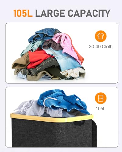 • Laundry Basket with Lid, Hipsignal 105L Laundry Collector with Removable Laundry Bag, Foldable Bamboo Washing Basket, Laundry Closet Sorter, Laundry Bag, Laundry Bin, Black