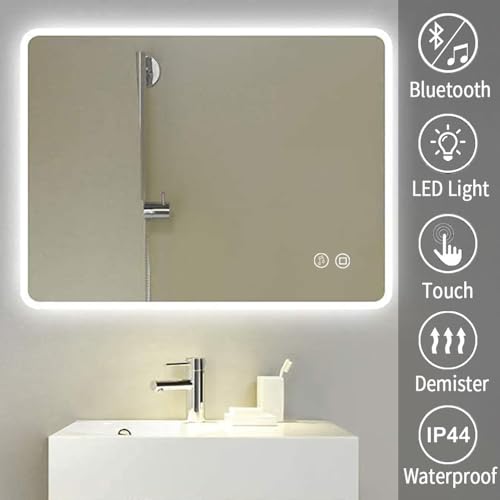 Dripex LED Bathroom Mirror with Bluetooth Speaker, Illuminated Wall Mounted Vanity Mirrors, Anti-fog Bathroom Wall Mirror with Touch Sensor Demister Pad Dimmable (800 * 600 mm)