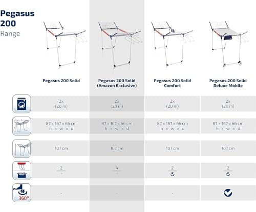 • Product details – Leifheit Pegasus 200 Solid dryer 105 x 56 x 7 cm closed, 182 x 56 x 89/98 cm Open, 20 m, 4 x small item holders and 5 x hangers, Weight 3.2 kg, [Amazon exclusive], Item – 81685