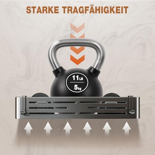 - Large capacity and robust – Our shower shelf without drilling made of rust-proof, scratch-resistant aluminium supports up to 10 kg. DIMENSIONS 2.6"H × 12.6"W × 5.1"D. With 12 hooks for shampoo, shower gel, soap and other bathroom essentials, space saving and safe storage