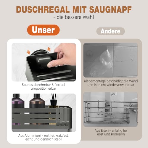 Lekesky Shower Shelf, No Drilling, Strong Suction Cups, Rustproof Aluminium Bathroom Shelf & Organiser, Removable Bath Shelf for Shower, Bathroom, Kitchen, Rental Apartment, Set of 2, Gunmetal Grey