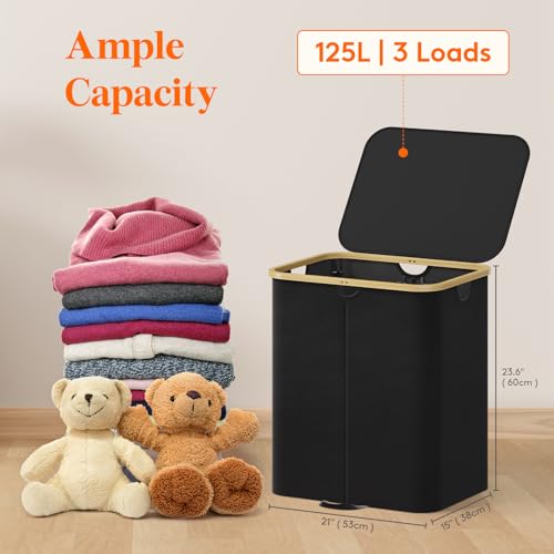 Lifewit 125L Laundry Basket with Lid, Clothes Hampers for Laundry with Bamboo Handles and Removable Laundry Bags, Large Foldable Laundry Hamper for Bedroom, Bathroom, Dorm, Laundry Room, Black