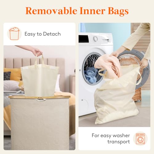 Lifewit 150L Laundry Basket with Lid 3 Compartments, Large Washing Basket with Removable Laundry Bags and Bamboo Handles, Clothes Hampers for Laundry, Bathroom, Bedroom, Dorm, Beige
