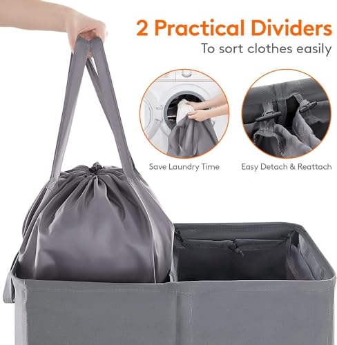 - 2 Compartments with Individual Removable Laundry Bags: This wash basket has two compartments, helping you to easily sort clothes by color and type, saving time for laundry day. Also comes with 2 detachable inner bags, making it easy to carry. No need to move the entire laundry basket.