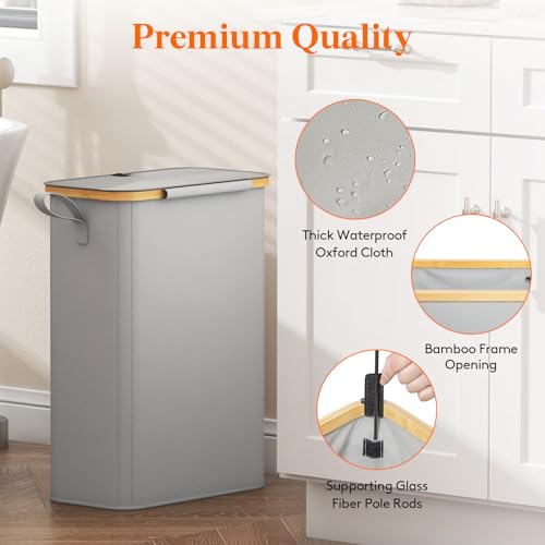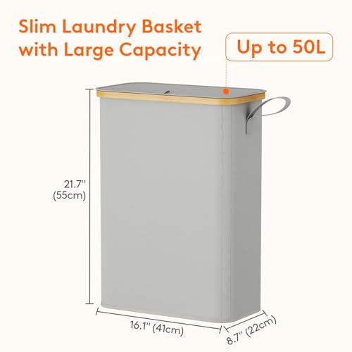 Lifewit 50L Slim Laundry Basket with Lid, Narrow Laundry Bin with Removable Bag & Bamboo Handles, Foldable Thin Dirty Clothes Hamper for Laundry, Bathroom, Bedroom, Dorm (Silver Grey)