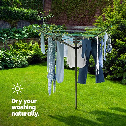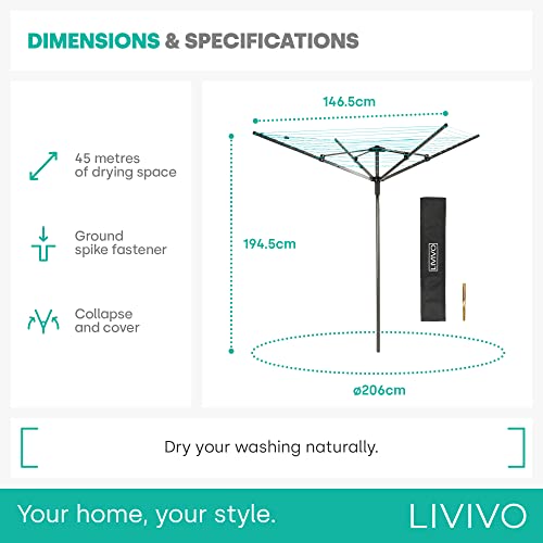 - LIVIVO 4 ARM 45M ROTARY AIRER – Built to last, our highly stable and extra heavy duty rotary washing line has a mould, rust and weatherproof powder coated tubular frame, 45M of PVC coated rope drying line – enough for a large family – and includes a protective cover and ground spike