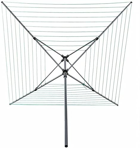 - 4 ARM 50M ROTARY AIRER : Built to last, our highly stable and extra heavy duty rotary whirligig has a mould, rust and weatherproof powder coated tubular frame, 50M of PVC coated rope drying line – enough for a large family – and includes a protective cover and ground spike.