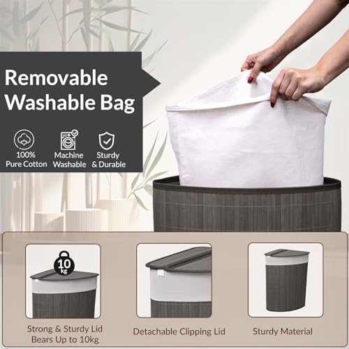 MantraRaj 58L Bamboo Laundry Basket Triangle Foldable Storage Hamper With Removable Cover Laundry Hamper with Lid Washing Clothes Basket Bin With Handle For Bedroom, Bathroom, Laundry (Grey)