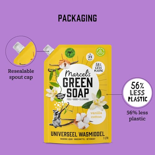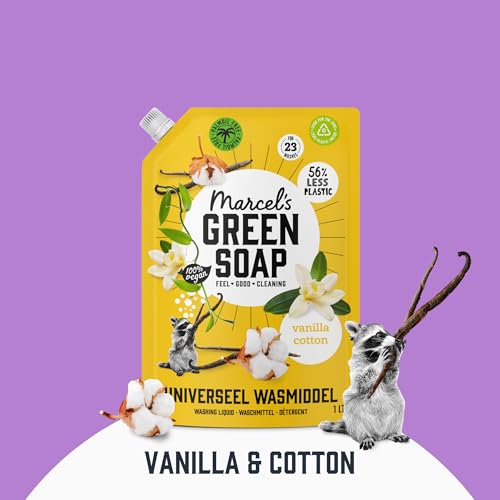- Marcel's Green Soap Universal Washing Liquid Vanilla & Cotton is palm oil-free, contains no aggressive chemicals and imbues your laundry with a gentle sweet scent.
