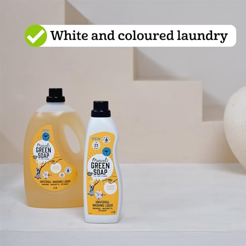 - Marcel's Green Soap Universal Washing Liquid Vanilla & Cotton is palm oil-free, contains no aggressive chemicals that harm the planet and imbues your laundry with a gentle sweet scent.