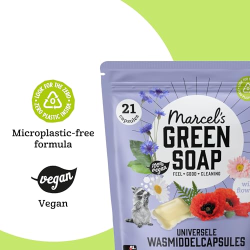 - Marcel's Green Soap laundry detergent capsules with the fragrance of wild flowers are double concentrated, vegan and EU eco-label certified. For laundry with a wonderful, long-lasting fragrance.
