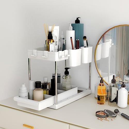 Meerveil Under Sink Storage, 2 Tiers Organizer Rack with 4 Hooks and 2 Hanging Cups, for Office Kitchen Bathroom, W22 x D40.7 x H32.5cm, White
