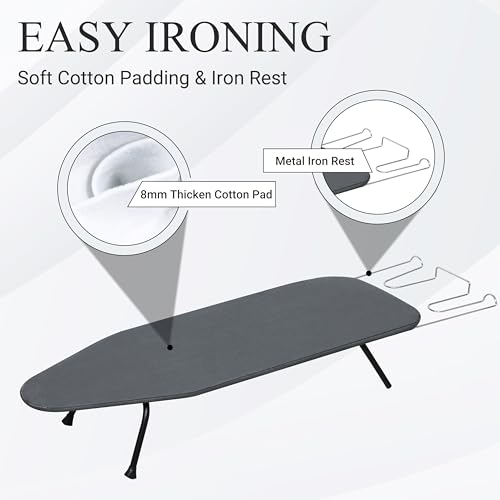 - 【AMAZING STURDAY】Say goodbye to gaps at the folds with its clever yet simple folding method. Unlike the usual wobbly folding tabletop ironing board, the sturdy fixing gives it an unparalleled flat surface, providing you with an unparalleled smooth and stable ironing experience.