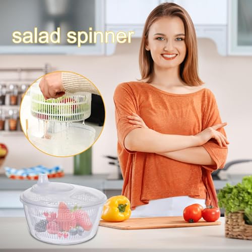 - ❉Practical Function: No more wet hands with our easy-to-use salad spinner! Featuring a convenient drainage outlet, the excess water can be poured out effortlessly without removing the cover. Simply press the knob and watch it for dry and clean salads. Perfect kitchen accessory for healthy meal prep.