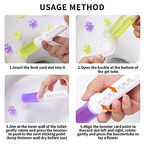 • EASY TO USE: 1. Piece together the dispenser, align the push rod with the card slot hole and insert it into the toilet bowl cleaner gel tube. 2. Open the gel tube cover (If there is toilet cleaning gel at the outlet, wipe it off with tissue). 3. Press the push rod against the toilet wall, and leave it vertically to prevent damage to the shape of the petals. 4. According to needs, the more flowers, the stronger the fragrance, usually 2-3 flowers are enough at one time.