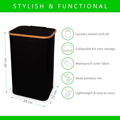 - Stylish & Discreet Design: Made with Oxford fabric and a bamboo rim, this large clothes hamper fits any room. The solid lid of this dirty clothes basket conceals laundry, keeping your space neat while blending in with modern bedroom or laundry decor.