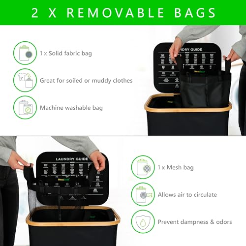 Nest Zest 100L Double Laundry Basket with Lid, 2 Compartments to Sort Washing, Hamper Laundry Bin with Care Guide & 2 Removable Inner Bags, Dirty Clothes Basket with Bamboo Rim Oxford Fabric (Black)