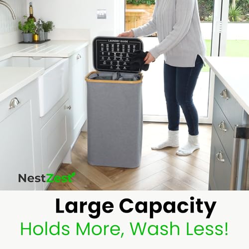 Nest Zest 100L Double Laundry Basket with Lid, 2 Compartments to Sort Washing, Hamper Laundry Bin with Care Guide & 2 Removable Inner Bags, Dirty Clothes Basket with Bamboo Rim Oxford Fabric (Grey)