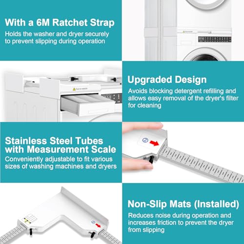 NIUXX Universal Stacking Kit for Washing Machines, Stacking Kit for 46-66 cm Washing Machine and Dryer, Washer and Dryers Stacker with Scale Mark Pipes and Ratchet Strap, Space Saving, White