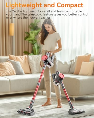 - Advanced Detection Light & V-Shaped Rotation Brush: The white detection light of 2401 cordless vacuum allows you to see the dust in dark corners better, while use V-Shape Dual Brush System (7000RPM) adapts to all flooring types, featuring soft nylon guards for hardwood protection and reduces hair tangles, which ensures the Stick Vacuum Cleaner more efficient cleaning and gives you a better cleaning experience.