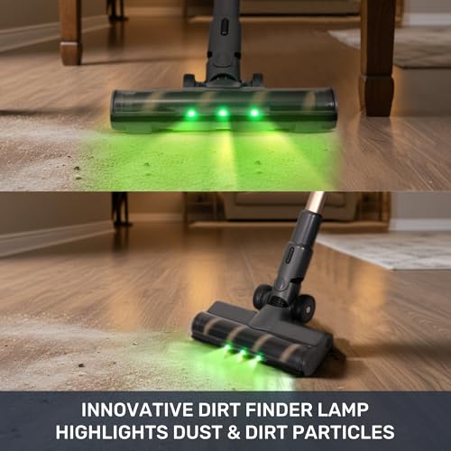 - BUILT IN DUST & DIRT FINDER LAMP – The floor tool features bright green LEDs at the front, which highlight dust and dirt particles on your floor. Perfect for hard floors and lower light conditions where dust and dirt can be hard to see, so you never miss a spot!