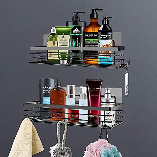 Orimade Shower Caddy with 5 Hooks for Hanging Razor and Sponge Adhesive Shower Shelf Bathroom Accessories Organiser Storage Kitchen Rack Rustproof No Drilling Stainless Steel – 2 Pack (Black)