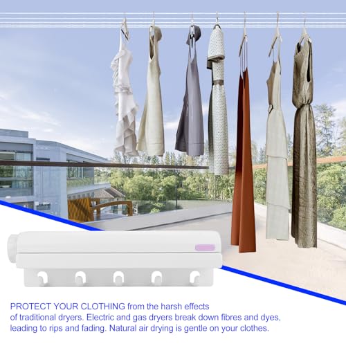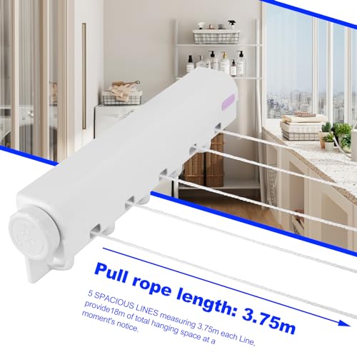 - 🎽RETRACTABLE DESIGN, SAVE SPACE: Due to the retractable design of the 5 line retractable washing line airer, the compact retractable clothesline provides ample space for your clothes and will not take up too much home space. After use, you can Store them away and use natural sunlight to dry your clothes, a cost-effective and environmentally friendly way to dry your clothes.