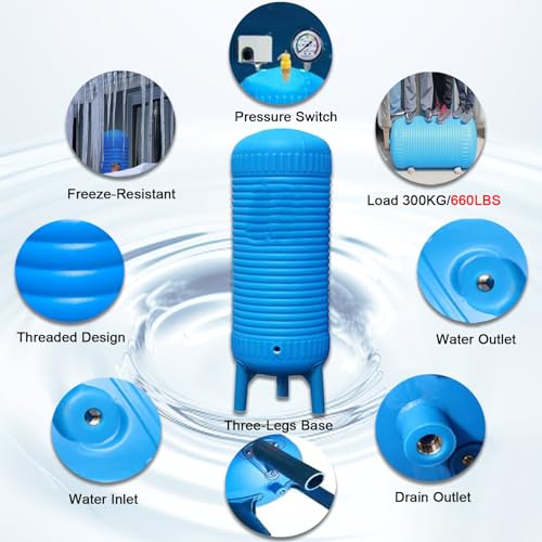 - 💧【 Eco-friendly PE Water Tank 】: The well water pressure tank is made of food-grade PE material, 1.5cm thick tank wall, high toughness, pressure resistant, sunlight resistant, freeze-proof, -60℃ will not freeze; load 300kg/660lbs. It can be directly contacted with water, which is in line with the standard of human consumption water, clean and healthy.