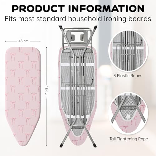 • Simple Installation: This pink bow-designed ironing board cover is compatible with boards measuring 128-133 cm in length and 39-42 cm in width. If your board is within these dimensions, this cover will fit flawlessly.