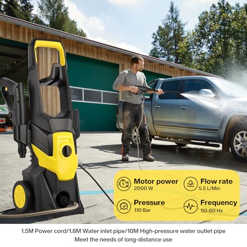 - 【Powerful Pressure Washer】2000W motor of pressure washers delivers 110Bar of robust water pressure and a 5.5L/min flow rate. Engineered for precision and power, this powered pressure washers delivers strong cleaning performance, helping to improve your efficiency.