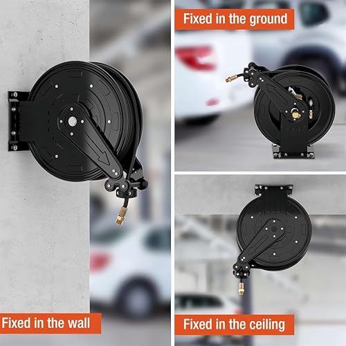 • Secure Mounting Solutions: With an adjustable guide arm and sturdy steel base, this pressure washer hose reel can be securely mounted on any flat surface, making it suitable for both indoor and outdoor use.