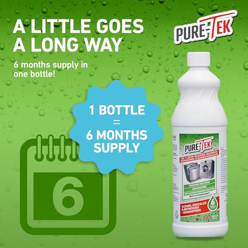 - Proudly Made in the UK – Pure-Tek offers an unsurpassed cleaning performance resulting in a sparkling clean washing machine/dishwasher ! Try this 960ml, 6 month supply and you'll get the ultimate cleaning, descaling and refreshing limescale remover liquid