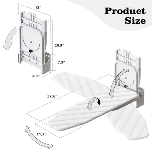 - 🥼【Space Saving Design】 Folding ironing station can be installed on the wall. Double folding storage function for small spaces; When ironing boards open, 37.4'' ( L ) x 12.8'' (W) ; And when its fold, 4.7'' ( L ) x 12.8'' (W), folding storage function is very suitable for small spaces dorm rooms, small laundry room and apartments.