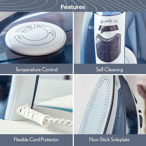 Quest Steam Iron 2200W – 40s Rapid Heat‑Up, Variable Temp, Self‑Clean & Non‑Stick Soleplate, Lightweight Blue Clothes Iron