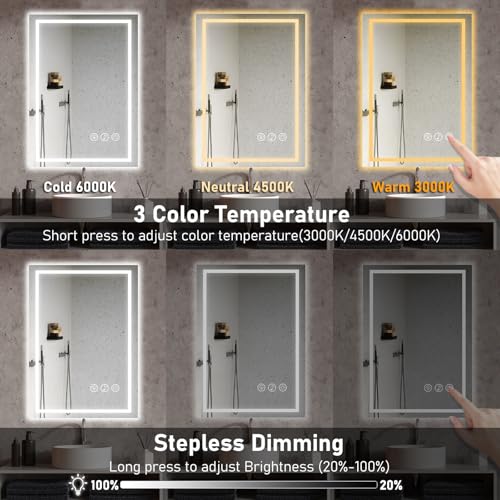 - 【Anti-fog and Unique Fonction】LED bathroom mirror with defog function, just touch the anti-fog button on the mirror, it need 5-10 minutes to clear this led bathroom mirror completely, safe and energy-saving. LED mirror's light and anti-fog are controlled separately
