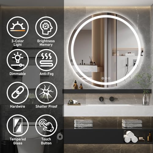 Ratsamee LED Bathroom Vanity Mirror with LED Lights – 800mm Round Anti-Fog Wall Mirror, 3-Color Dimmable Frontlit Illumination for Makeup, Wall Mounted Bathroom Lighting