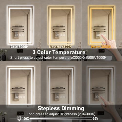 【Anti-Fog Function】 This LED bathroom mirror features a defog function. Simply touch the anti-fog button, and the mirror will clear completely within 5-10 minutes. It’s safe, energy-efficient, and the light and anti-fog functions are controlled separately