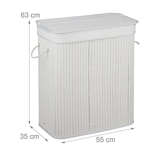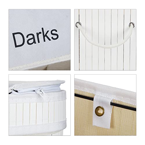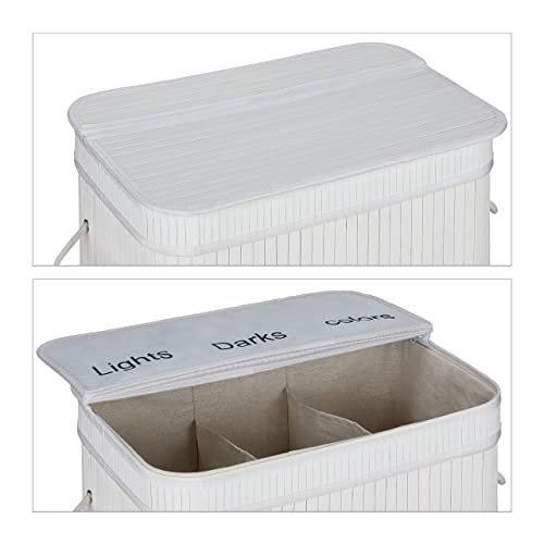 Relaxdays Bamboo Laundry, Clothes Container, 3 Compartments, Folding, Rectangular Basket, 63 x 55 x 35cm, White