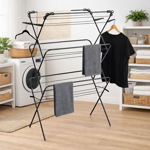 - 🌍 Dimensions & Eco-Friendly: Save energy by air drying! Measuring approximately W80 x D40 x H137cm, this black airer fits neatly in hallways. It serves as an eco-friendly drying solution, protecting fabrics from tumble dryer damage. With a sleek black design, it looks modern compared to basic white drying racks. Effortless to set up, this drying stand is the practical answer to your needs, combining efficiency with style.