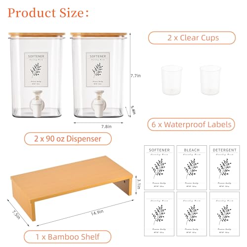 - COMPLETE DISPENSER SET: The liquid laundry detergent dispenser set includes everything you need to organize and decorate your laundry room: 2 x 96 oz dispensers, 2 lids, 6 waterproof labels, 3 taps, 1 wooden shelf, and 3 cups.