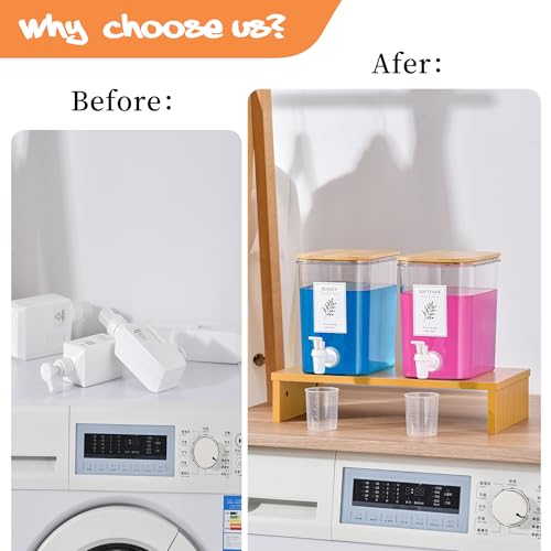 - BAMBOO LID & WOODEN SHELF: Say goodbye to traditional plastic lids. Our laundry soap dispenser features a specially crafted lid and wooden shelf, combining storage with nature. It adds a natural touch to your laundry room while easy storage.