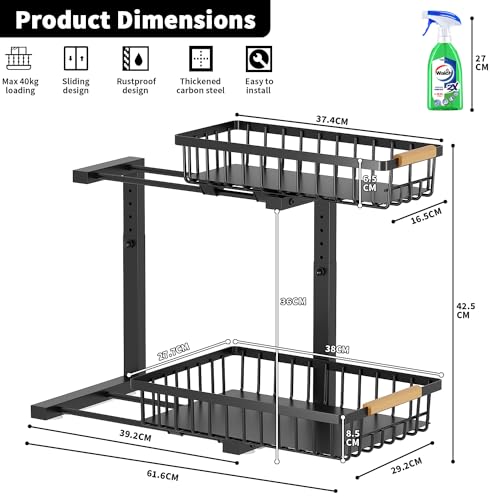 - 2 SLIDING BASKETS: Say goodbye to clutter! Our 2 tier under sink organiser can hold up to 40kg. Designed for easy access to your bathroom or kitchen essentials, both the upper and lower baskets effortlessly slide out, giving you full access to your items without hassle. Plus, each basket features safety buckles to prevent it from being pulled all the way out—no more accidental spills! (Product Size: 29.5×39.2×42.5cm, with baskets)