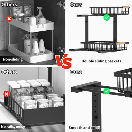 - SMOOTH SLIDE RAIL DESIGN: Our under sink shelf features 2 smooth sliding rails under each basket and elegant wooden handles, making it easy to pull out the baskets even in tight spaces. It glides effortlessly, without hitting pipes or causing annoying noise—great for a calm, organized environment.