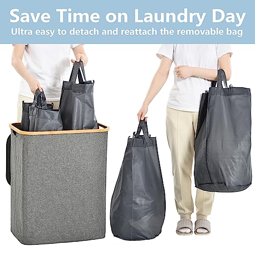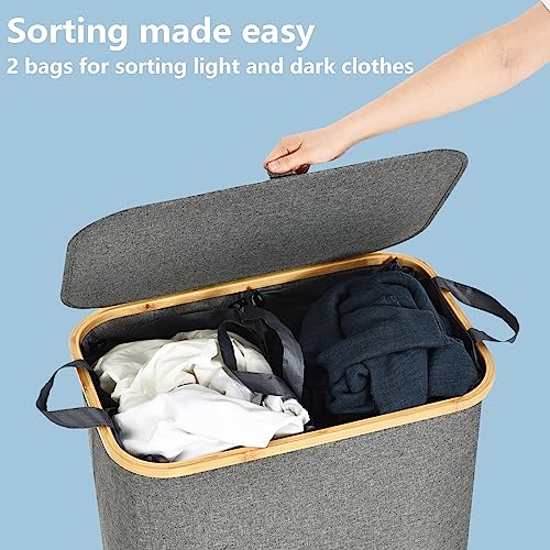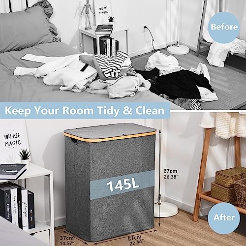 - Large Capacity & Sturdy: Laundry basket 2 compartments with 145L large capacity( L 57x W 37 x H 67 CM), made of high-grade cationic cloth and bamboo frame, plus compact stitching, staying in good condition without wrinkles or tearing even after many times using. The bamboo laundry basket frame is not easy to break.
