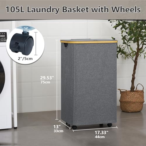 ROSOS Laundry Basket with Wheels – 105L Waterproof Bin, Lid & Removable Bag, Bamboo Handles, Grey