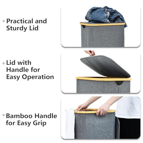 - Large Capacity & Sturdy: Large Laundry Basket with 105L large capacity, made of high-grade cationic cloth and bamboo frame, plus compact stitching, staying in good condition without wrinkles or tearing even after many times using. The bamboo laundry bin frame is not easy to break.